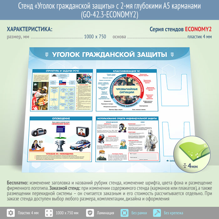 Стенд «Уголок гражданской защиты» с 2-мя глубокими А5 карманами (GO-42.3-ECONOMY2) в Новокузнецке купить