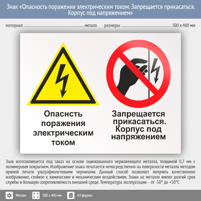 Знак «Опасность поражения электрическим током. Запрещается прикасаться. Корпус под напряжением», КЗ-47 (металл, 400х300 мм) в Новокузнецке купить