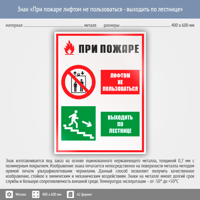 Знак «При пожаре лифтом не пользоваться - выходить по лестнице», КЗ-73 (металл, 400х600 мм) в Новокузнецке купить