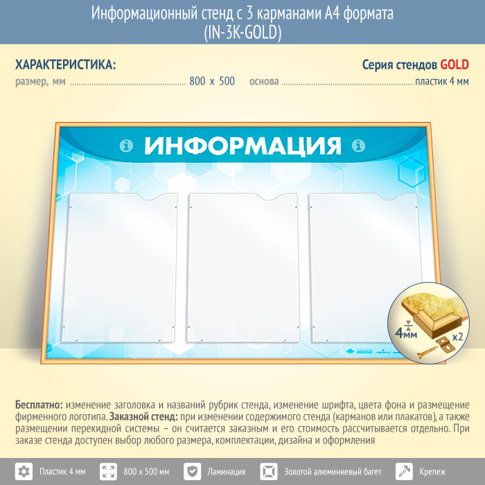 Информационный стенд с 3 карманами А4 формата (IN-3K-GOLD) в Новокузнецке купить