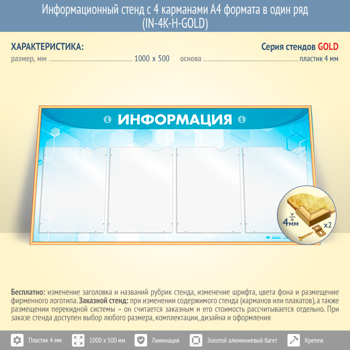 Информационный стенд с 4 карманами А4 формата в один ряд (IN-4K-H-GOLD) в Новокузнецке купить