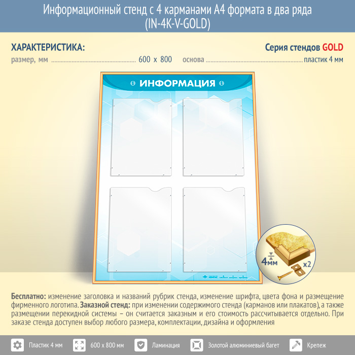 Информационный стенд с 4 карманами А4 формата в два ряда (IN-4K-V-GOLD) в Новокузнецке купить