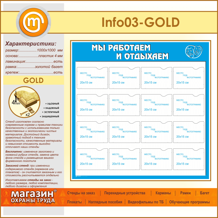 Стенд «Мы работаем и отдыхаем» с 16 карманами А5 формата (IN-03-GOLD) в Новокузнецке купить