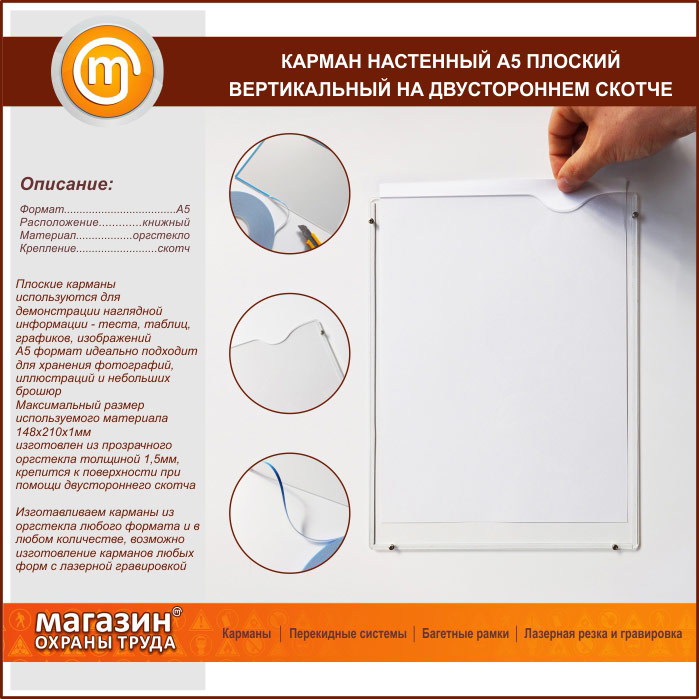 Карман настенный А5 плоский горизонтальный на двустороннем скотче в Новокузнецке купить