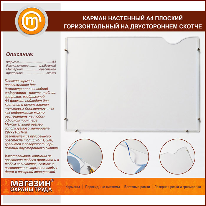 Карман настенный А4 плоский горизонтальный на двустороннем скотче в Новокузнецке купить