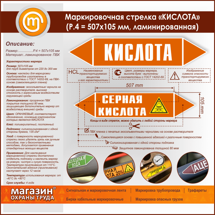 Маркировочная стрелка «КИСЛОТА» (P.4 = 507х105 мм, самоклеящаяся плёнка с ламинированием) в Новокузнецке купить