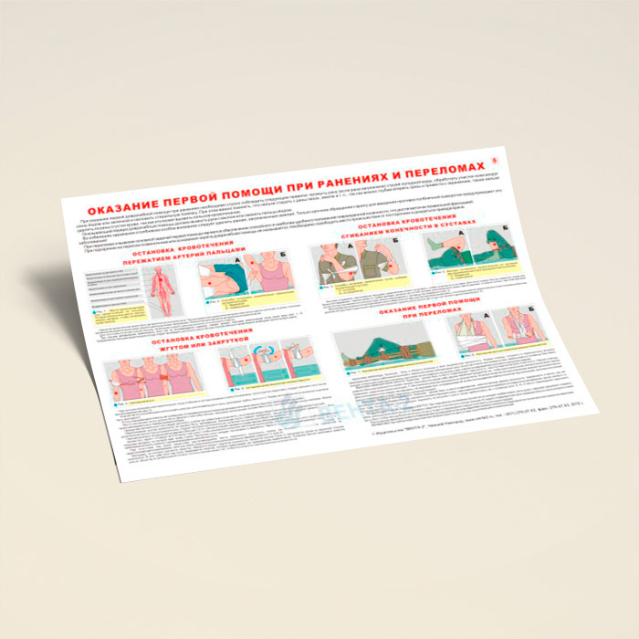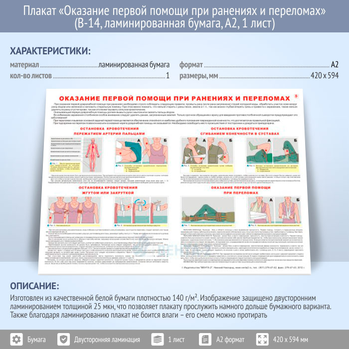 Плакат «Оказание первой помощи при ранениях и переломах» (В-14, ламинированная бумага, А2, 1 лист) в Новокузнецке купить