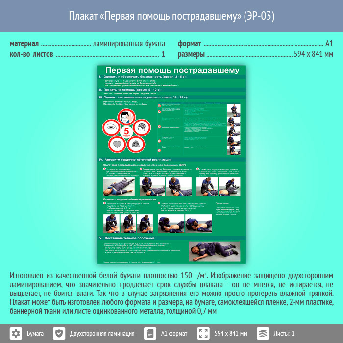 Плакат «Первая помощь пострадавшему» (ЭР-03, ламинированная бумага, А1, 1 лист) в Новокузнецке купить