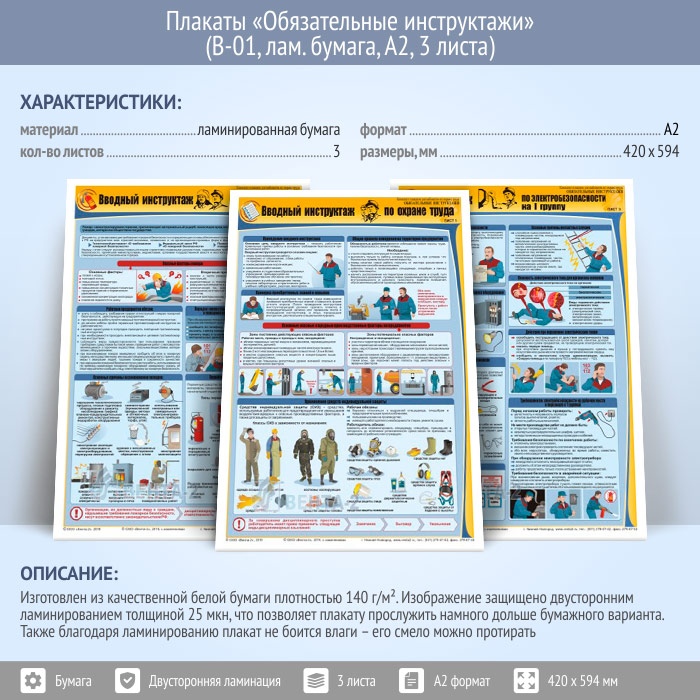 Плакаты «Обязательные инструктажи» (вводный инструктаж, вводный противопожарный инструктаж, инструктаж на I группу по электробезопасности) (В-01, ламинированная бумага, А2, 3 листа) в Новокузнецке купить