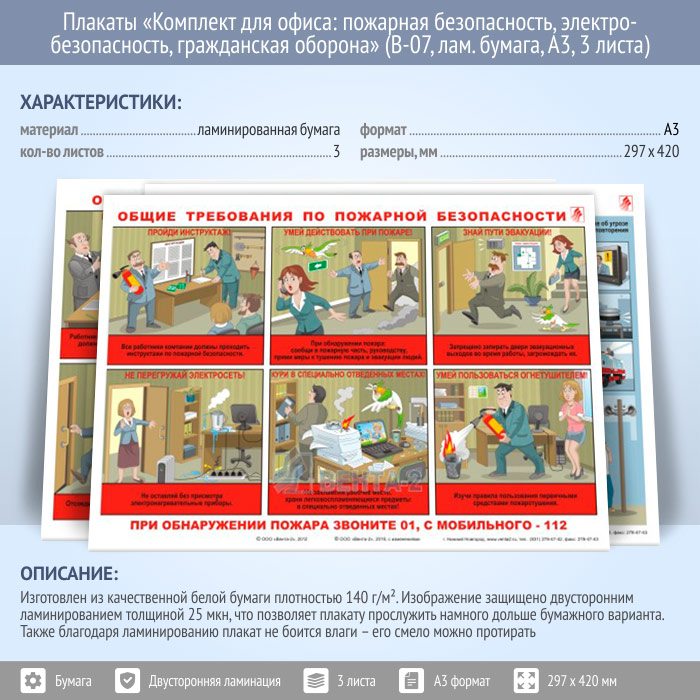 Плакаты «Комплект для офиса: пожарная безопасность, электробезопасность, гражданская оборона» (В-07, ламинированная бумага, А3, 3 листа) в Новокузнецке купить
