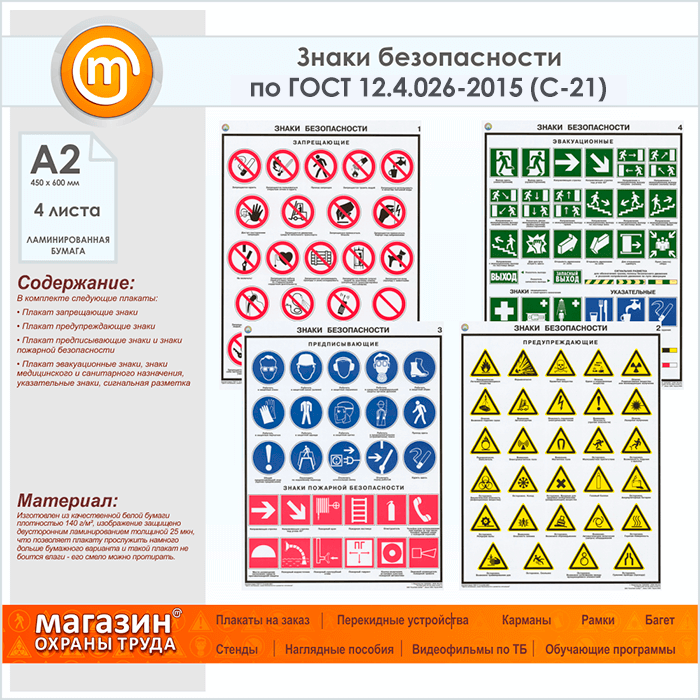 Плакаты «Знаки безопасности по ГОСТ 12.4.026-2015» (С-21, ламинированная бумага, А2, 4 листа) в Новокузнецке купить