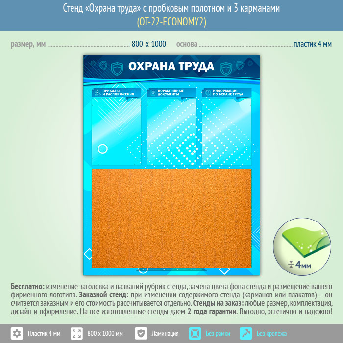 Стенд «Охрана труда» с пробковым полотном и 3 карманами (OT-22-ECONOMY2) в Новокузнецке купить