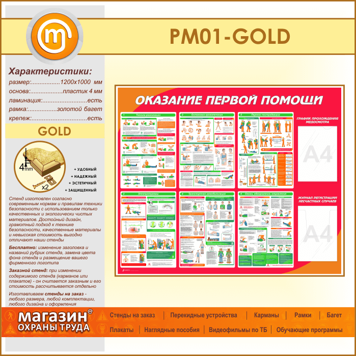 Стенд «Оказание первой помощи» с плоским и объемным карманами (PM-01-GOLD) в Новокузнецке купить