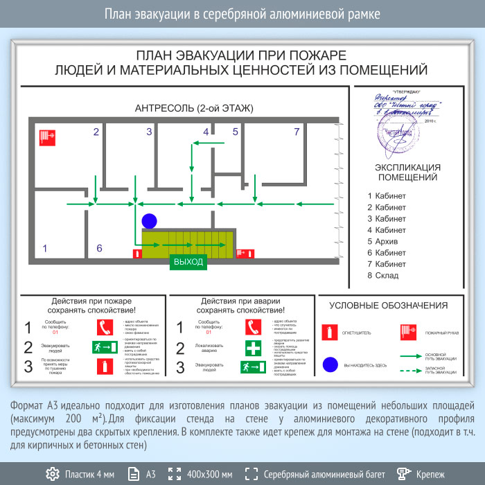 План эвакуации в серебряной алюминиевой рамке (А3 формат) в Новокузнецке купить