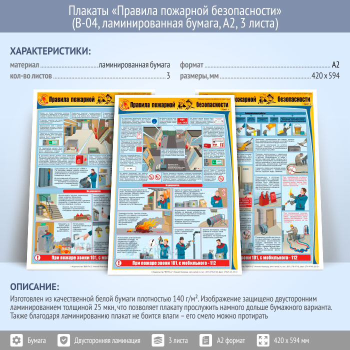 Плакаты «Правила пожарной безопасности» (В-04, ламинированная бумага, А2, 3 листа) в Новокузнецке купить