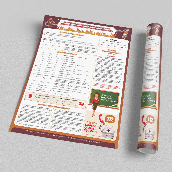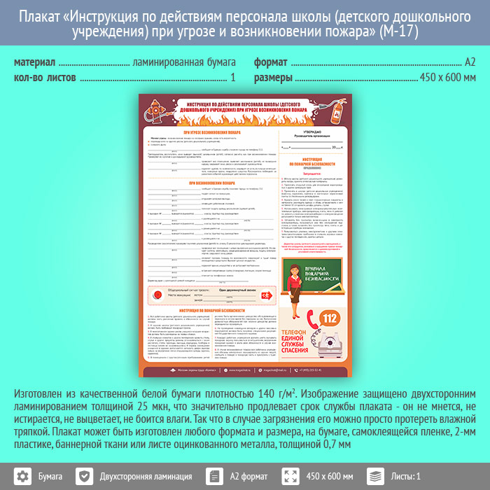 Плакат «Инструкция по действиям персонала школы (детского дошкольного учреждения) при угрозе и возникновении пожара» (М-17, ламинированная бумага, А2, 1 лист) в Новокузнецке купить