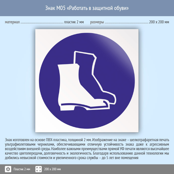Знак M05 «Работать в защитной обуви» (пластик, 200х200 мм) в Новокузнецке купить