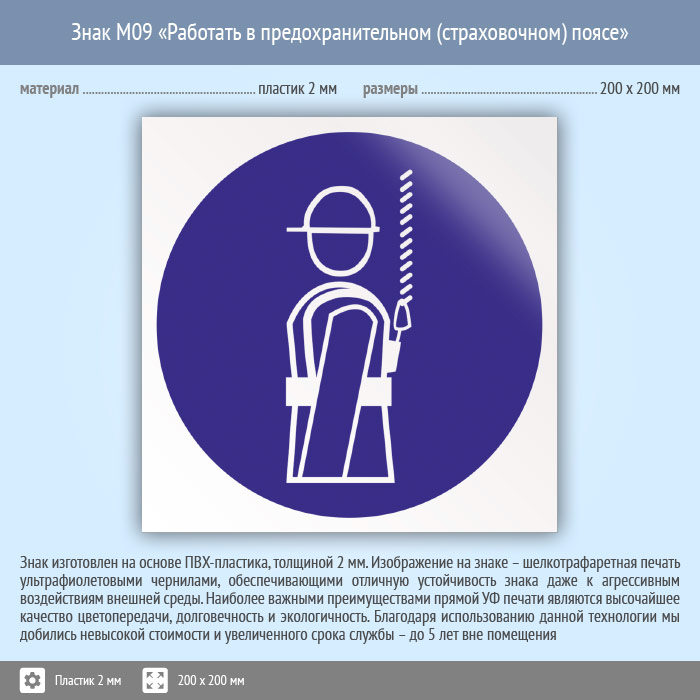 Знак M09 «Работать в предохранительном (страховочном) поясе» (пластик, 200х200 мм) в Новокузнецке купить
