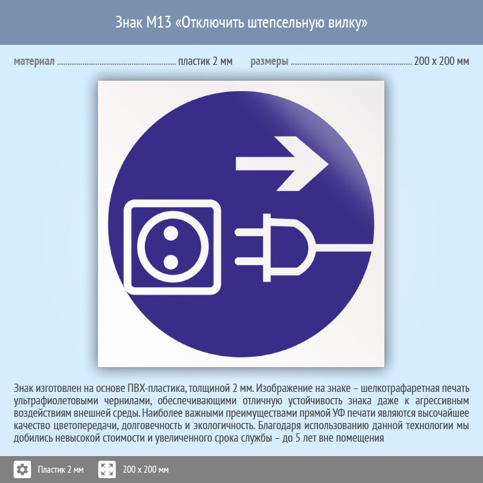 Знак M13 «Отключить штепсельную вилку» (пластик, 200х200 мм) в Новокузнецке купить