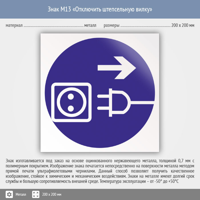 Знак M13 «Отключить штепсельную вилку» (металл, 200х200 мм) в Новокузнецке купить