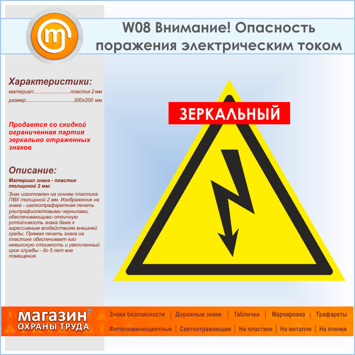 Знак W08 «Внимание! опасность поражения электрическим током» (пластик, сторона 200 мм) (знак зеркально отражен) в Новокузнецке купить