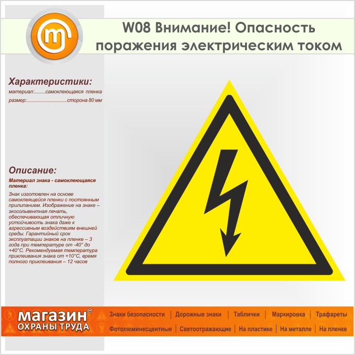 Знак W08 «Внимание! опасность поражения электрическим током» (пленка, сторона 80 мм) в Новокузнецке купить