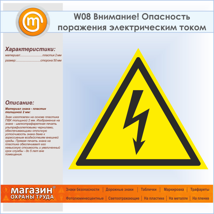 Знак W08 «Внимание! опасность поражения электрическим током» (пластик, сторона 50 мм) в Новокузнецке купить