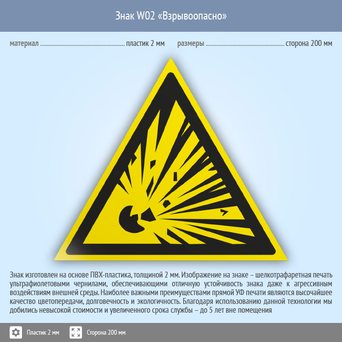 Знак W02 «Взрывоопасно» (пластик, сторона 200 мм) в Новокузнецке купить