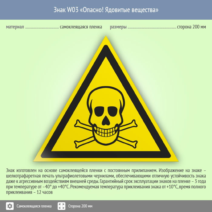 Знак W03 «Опасно! ядовитые вещества» (пленка, сторона 200 мм) в Новокузнецке купить