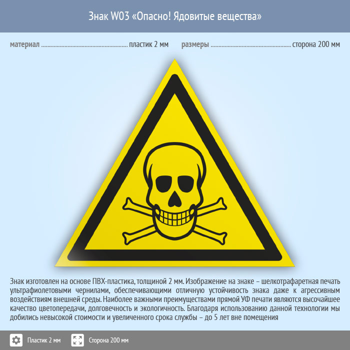 Знак W03 «Опасно! ядовитые вещества» (пластик, сторона 200 мм) в Новокузнецке купить