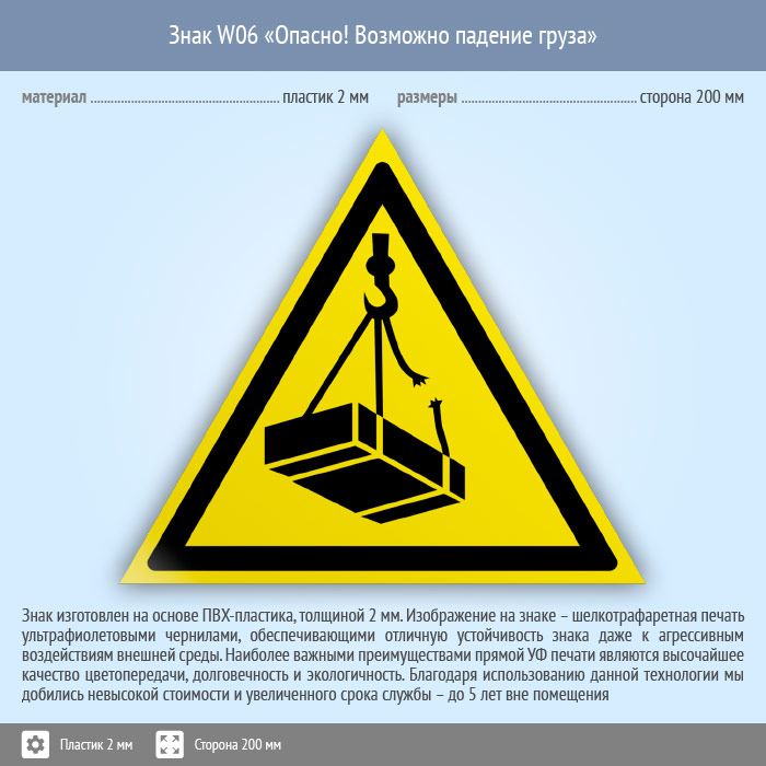 Знак W06 «Опасно! возможно падение груза» (пластик, сторона 200 мм) в Новокузнецке купить