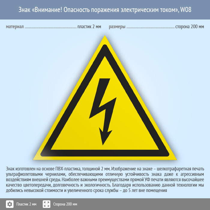 Знак W08 «Внимание! опасность поражения электрическим током» (пластик, сторона 200 мм) в Новокузнецке купить