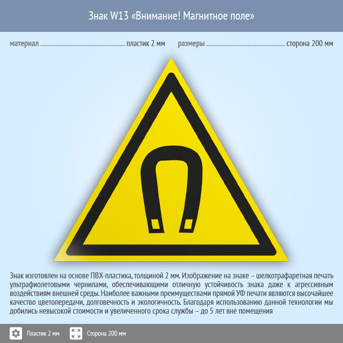 Знак W13 «Внимание! магнитное поле» (пластик, сторона 200 мм) в Новокузнецке купить