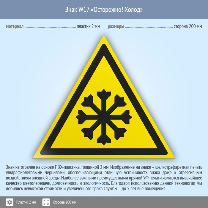 Знак W17 «Осторожно! холод» (пластик, сторона 200 мм) в Новокузнецке купить