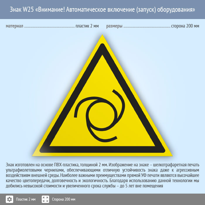 Знак W25 «Внимание! автоматическое включение (запуск) оборудования» (пластик, сторона 200 мм) в Новокузнецке купить