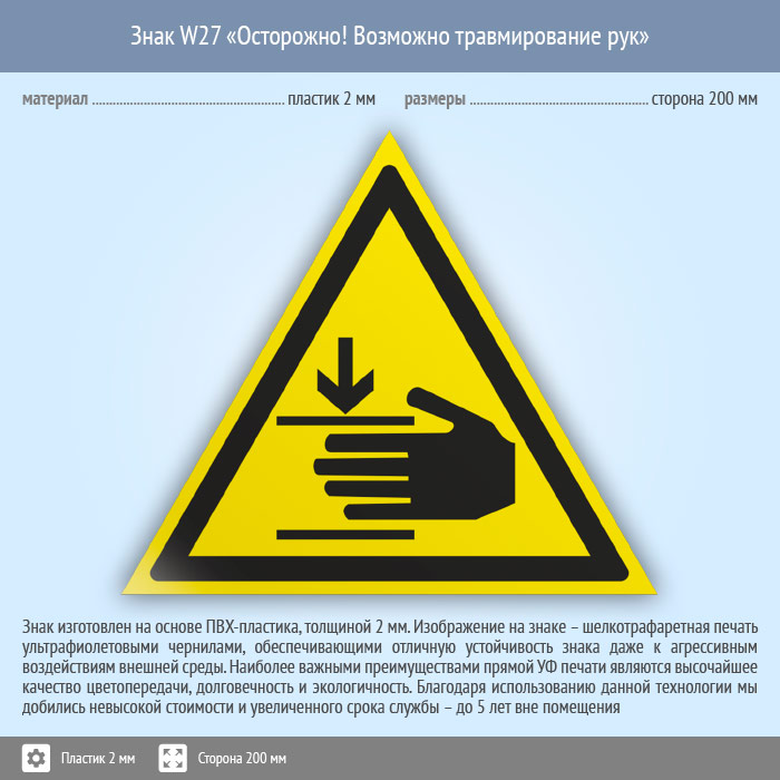 Знак W27 «Осторожно! возможно травмирование рук» (пластик, сторона 200 мм) в Новокузнецке купить