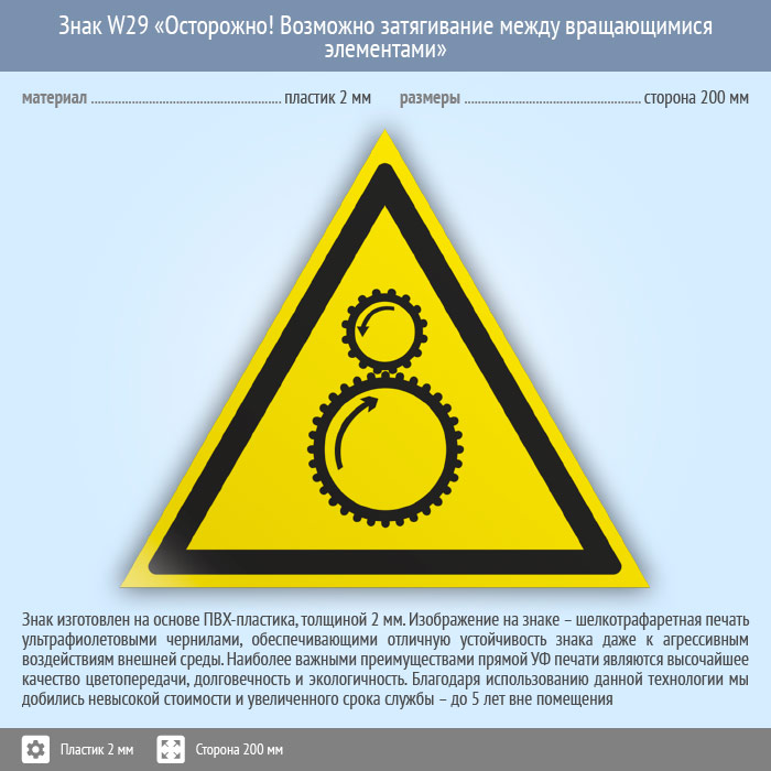 Знак W29 «Осторожно! возможно затягивание между вращающимися элементами» (пластик, сторона 200 мм) в Новокузнецке купить