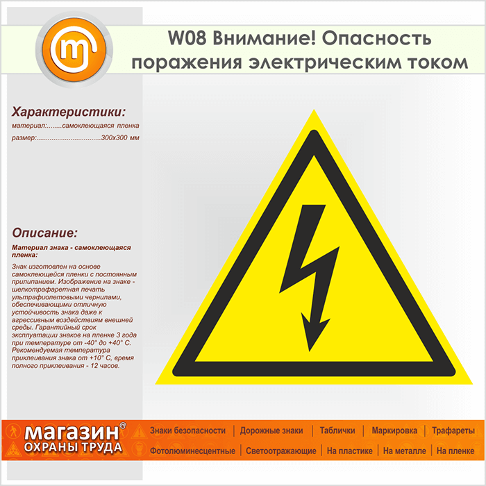 Знак W08 «Внимание! опасность поражения электрическим током» (пленка, сторона 300 мм) в Новокузнецке купить