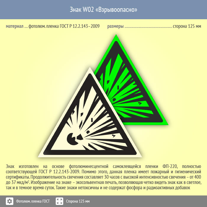 Знак W02 «Взрывоопасно» (фотолюминесцентная пленка ГОСТ 34428-2018, сторона 125 мм) в Новокузнецке купить