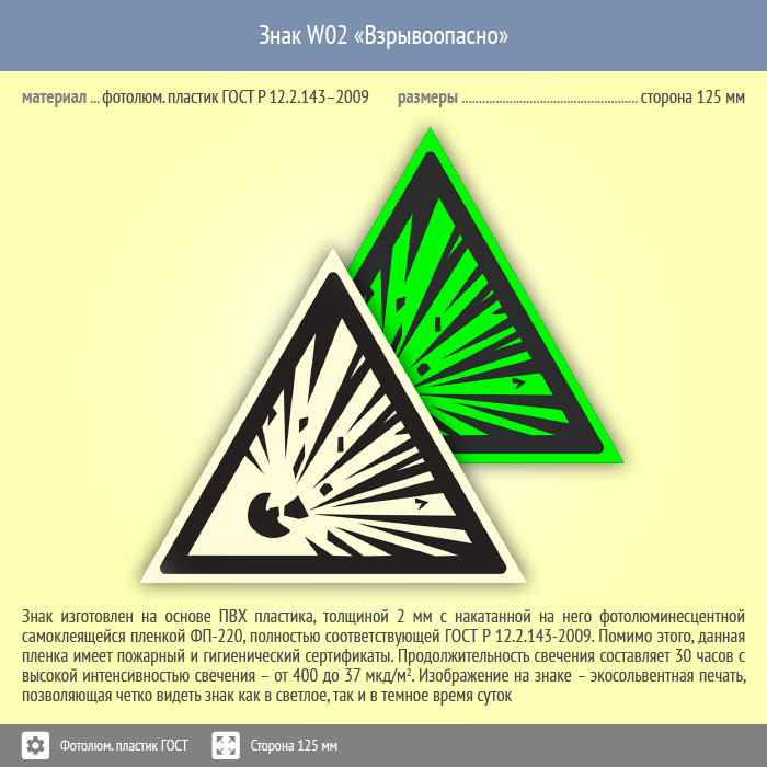 Знак W02 «Взрывоопасно» (фотолюминесцентный пластик ГОСТ 34428-2018, сторона 125 мм) в Новокузнецке купить