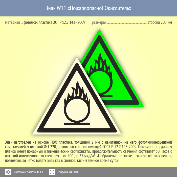 Знак W11 «Пожароопасно! Окислитель» (фотолюминесцентный пластик ГОСТ 34428-2018, сторона 200 мм) в Новокузнецке купить