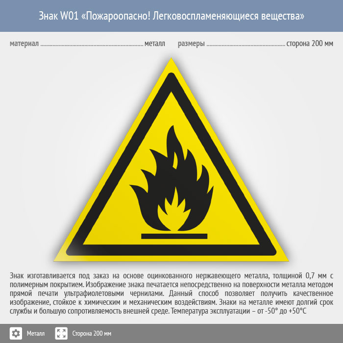 Знак W01 «Пожароопасно! легковоспламеняющиеся вещества» (металл, сторона 200 мм) в Новокузнецке купить