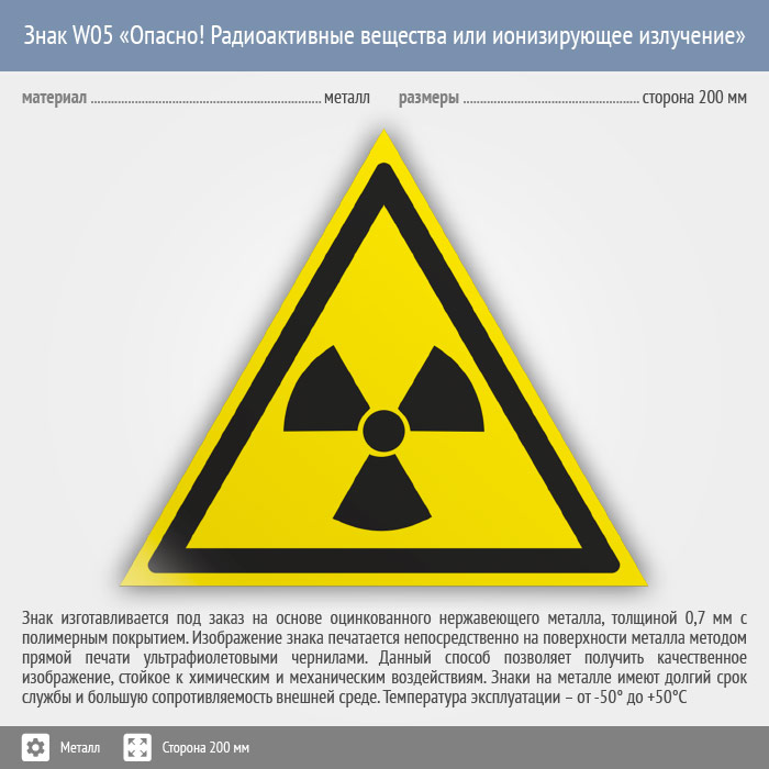 Знак W05 «Опасно! радиоактивные вещества или ионизирующее излучение» (металл, сторона 200 мм) в Новокузнецке купить