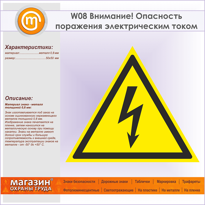 Знак W08 «Внимание! опасность поражения электрическим током» (металл, сторона 50 мм) в Новокузнецке купить