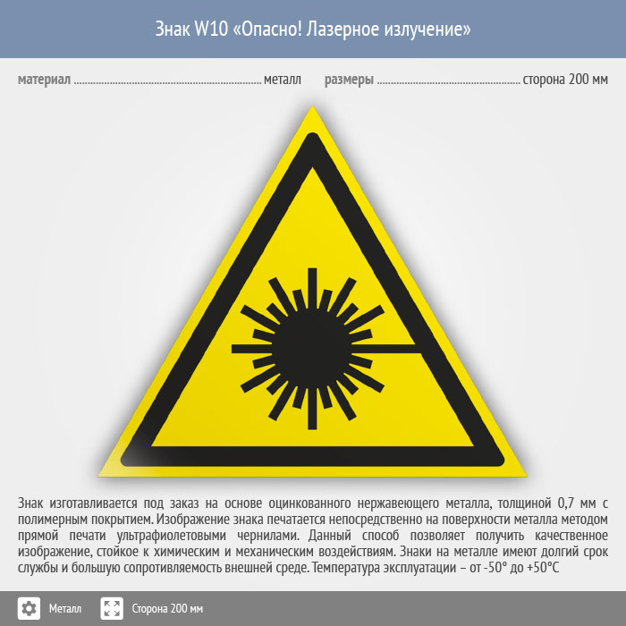Знак W10 «Опасно! лазерное излучение» (металл, сторона 200 мм) в Новокузнецке купить