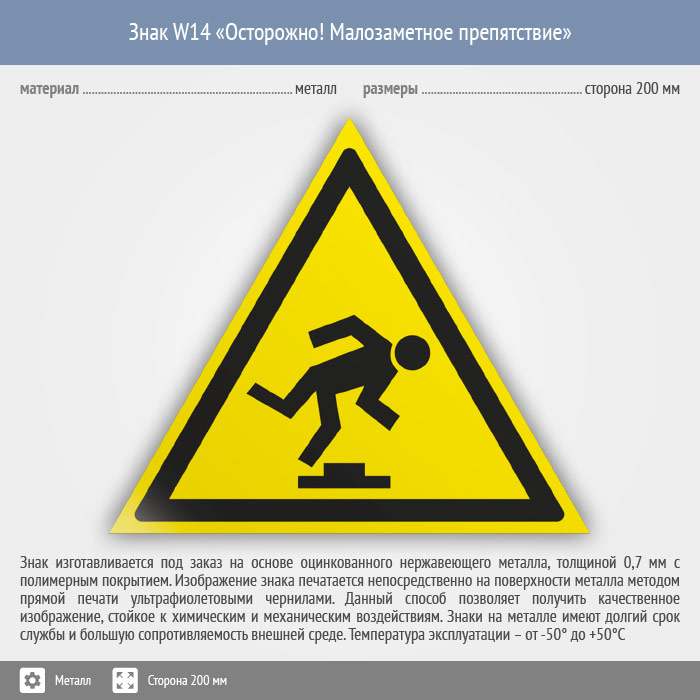 Знак W14 «Осторожно! малозаметное препятствие» (металл, сторона 200 мм) в Новокузнецке купить