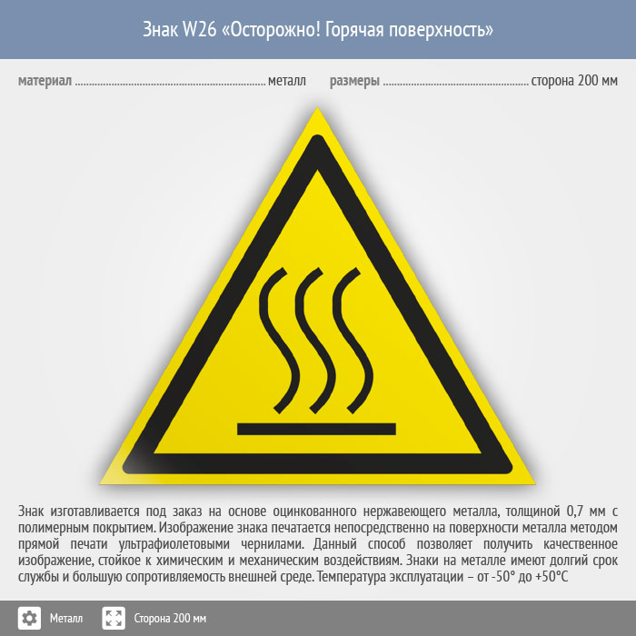 Знак W26 «Осторожно! горячая поверхность» (металл, сторона 200 мм) в Новокузнецке купить