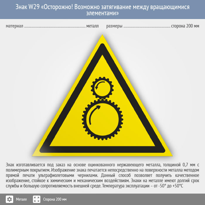 Знак W29 «Осторожно! возможно затягивание между вращающимися элементами» (металл, сторона 200 мм) в Новокузнецке купить