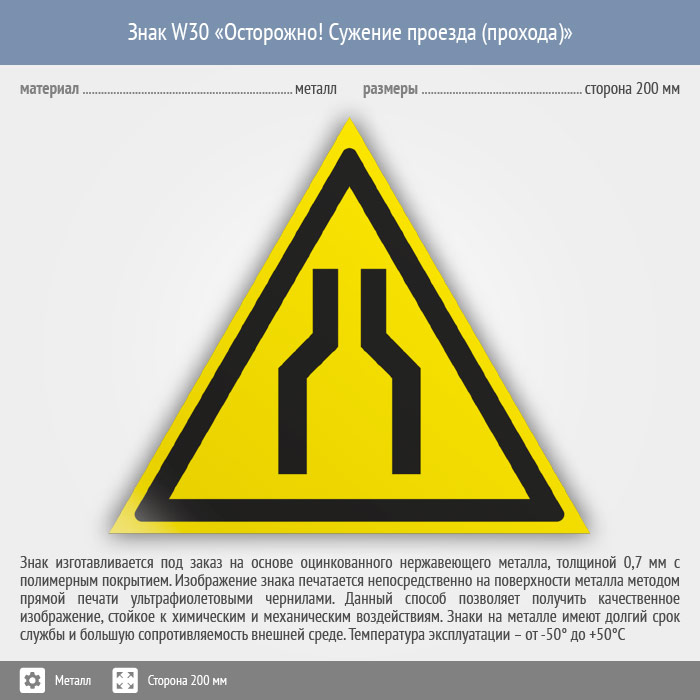 Знак W30 «Осторожно! сужение проезда (прохода)» (металл, сторона 200 мм) в Новокузнецке купить