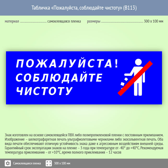 Табличка «Пожалуйста, соблюдайте чистоту», B113 (пленка, 300х100 мм)